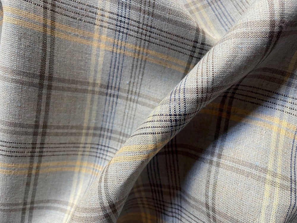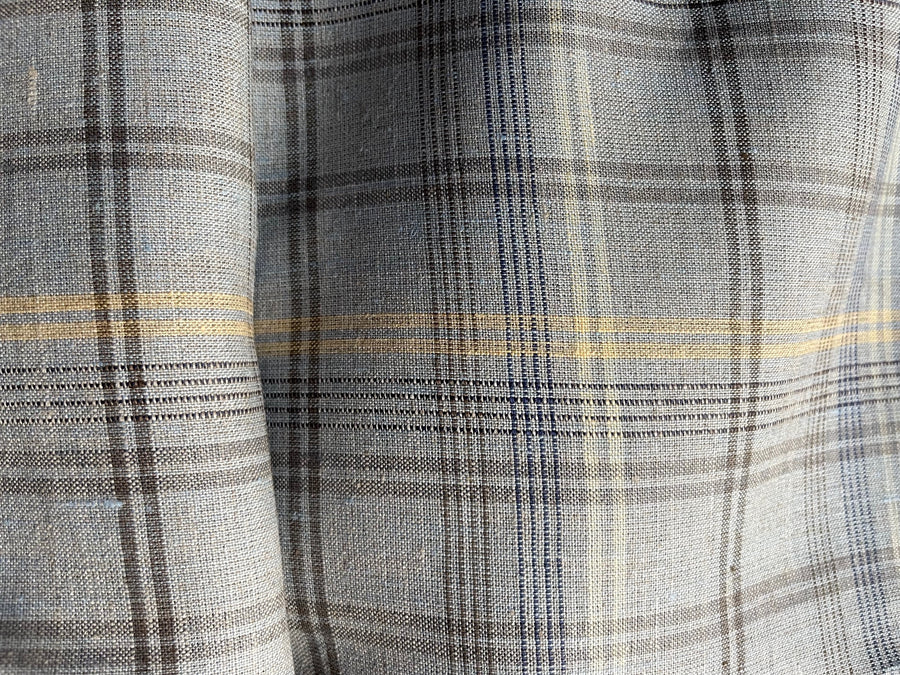 A delightful linen plaid in soft gray with blue undertones, grey, banana yellow, and taupe - this summer suiting weight linen is perfect for greeting spring with a simple sheath dress or a jacket. 4" repeat. Made in Poland. 100% linen. 59" wide.