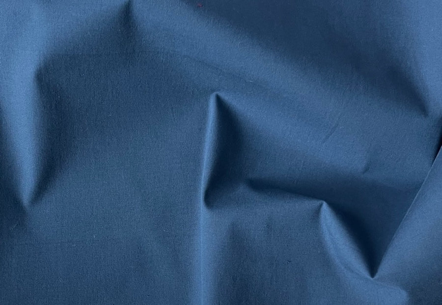 A high-end, stretch cotton poplin shirting in a steel denim blue - with a touch of lycra, this soft, tightly-woven shirting is perfect for bespoke shirts, blouses, or pajamas. Made in Italy. 96% cotton and 4% lycra. 60" wide.