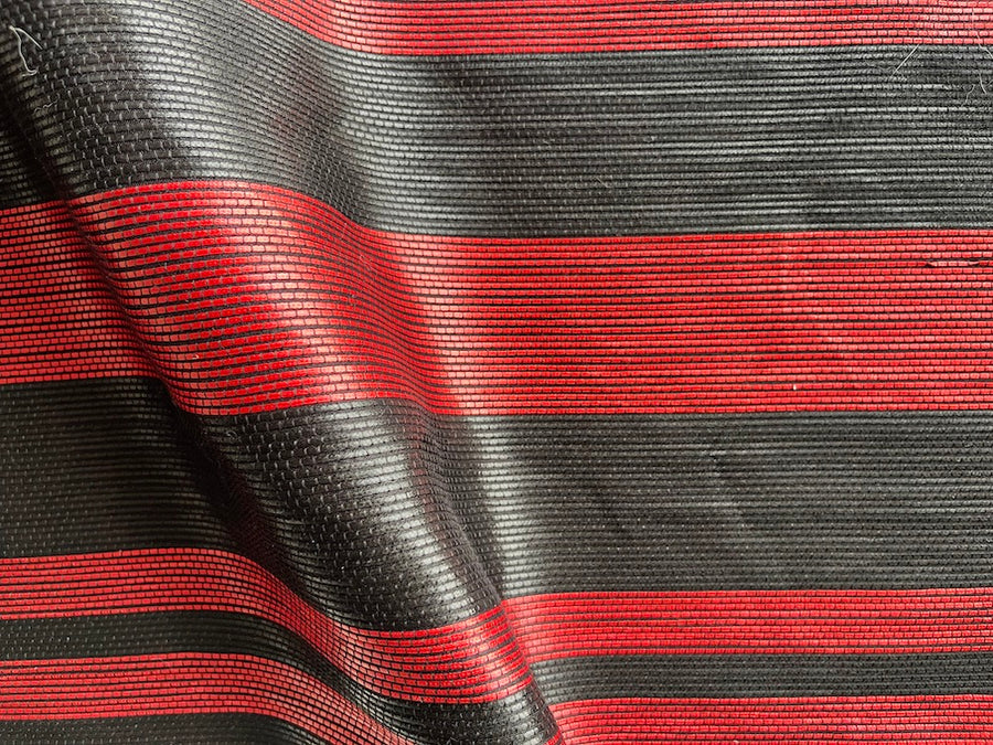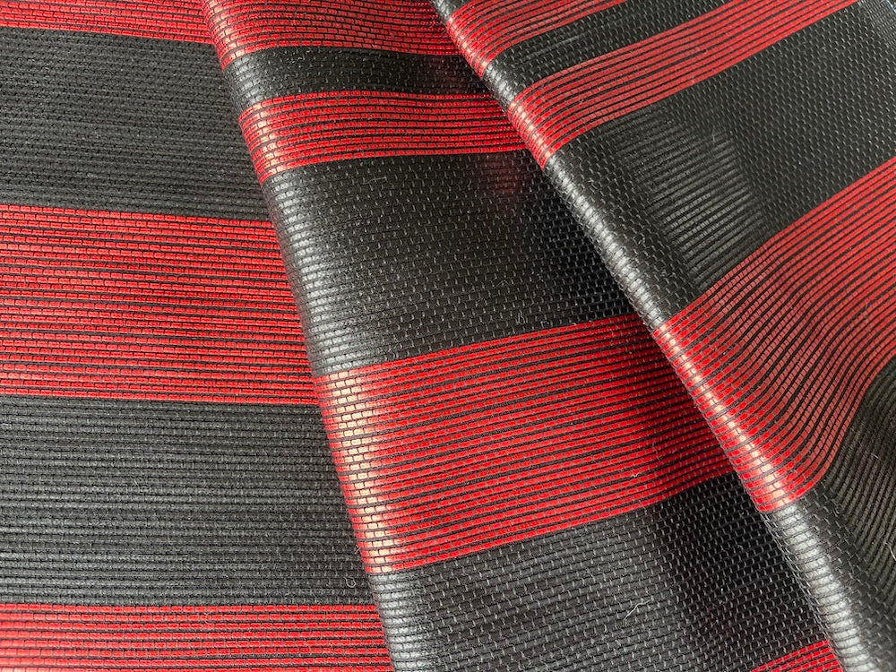 A silk, rayon, and cotton blend suiting with crosswise uneven stripes in maraschino cherry and black - this perky, fashionable suiting is perfect for a chic summer suit, a short sleeved jacket, or a cropped top. 50% silk, 25% cotton, and 25% rayon viscose blend. 59" wide.