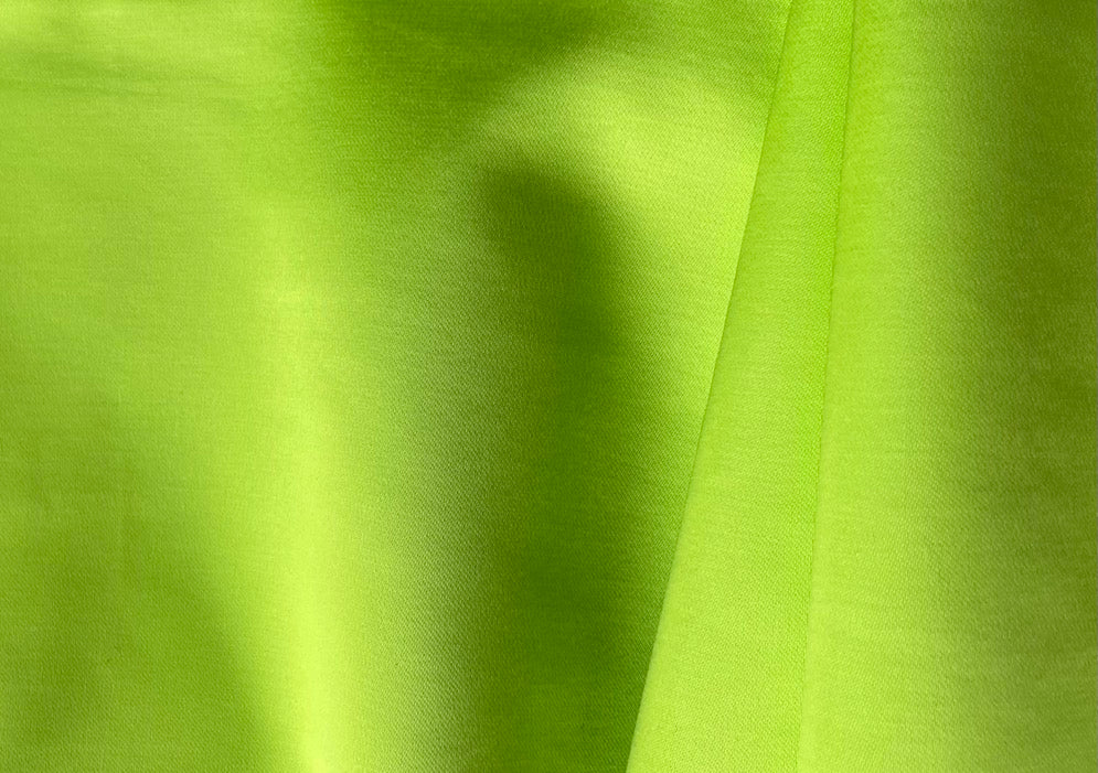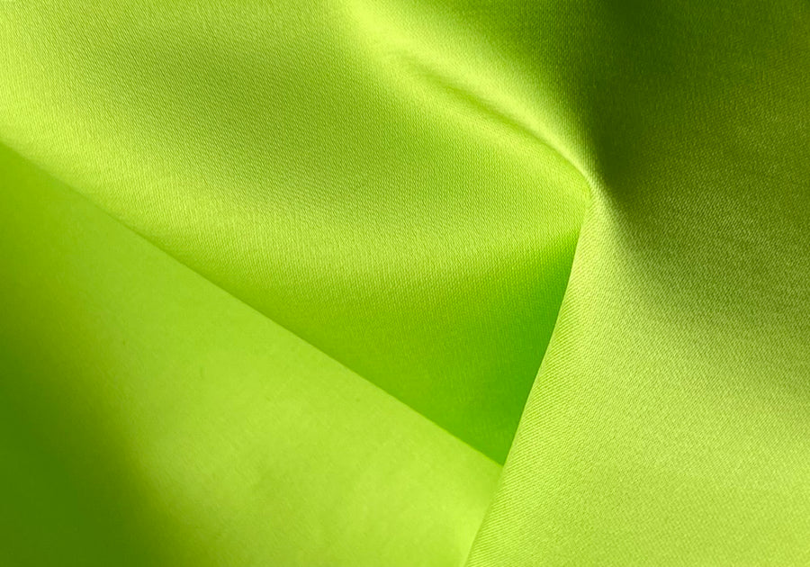 A fine quality cotton and rayon viscose blend duchess satin in neon apple green - stunning for a dramatic coat, slim cigarette pants, or a structured cocktail dress. Made in Italy. 59% cotton and 41% viscose. 56" wide.