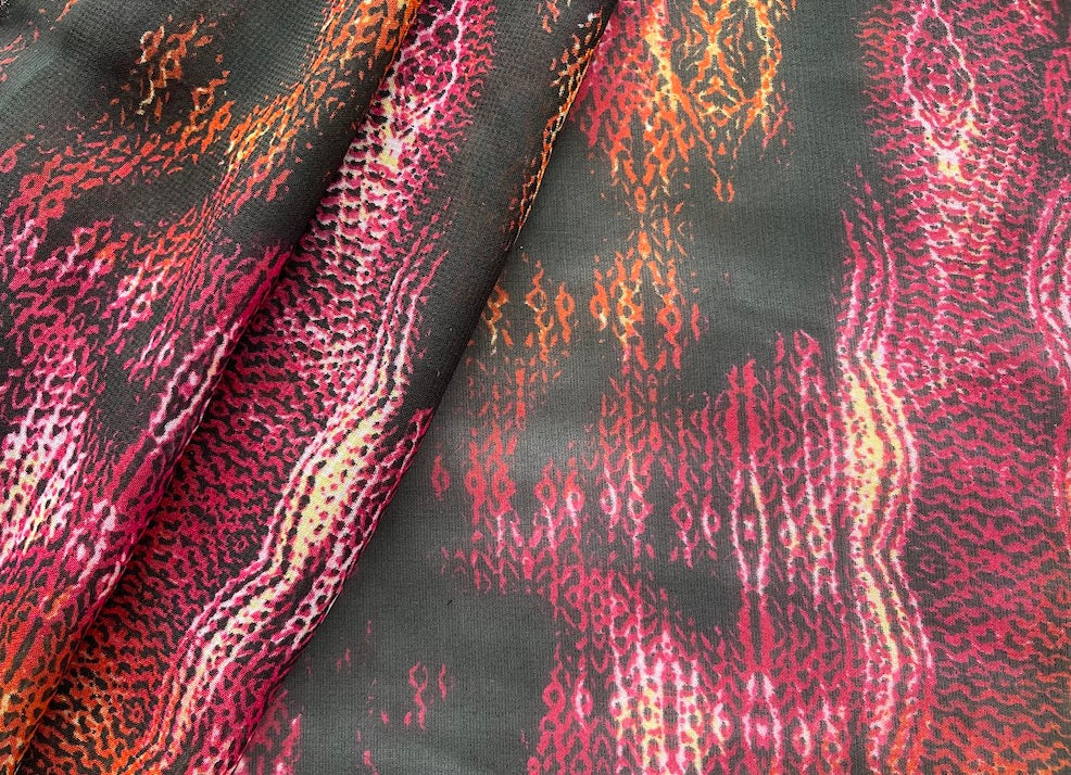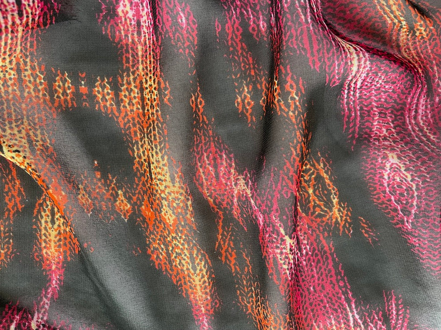 A semi-sheer polyester georgette in a stylish raspberry, pink, pumpkin, and soft yellow snake print on a black background - perfect for dresses, skirts, pretty tunics, or scarves. Made in Italy. 100% polyester. 56" wide.
