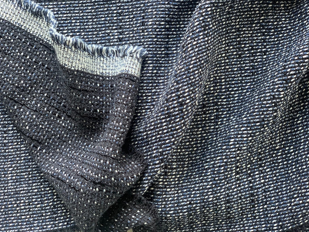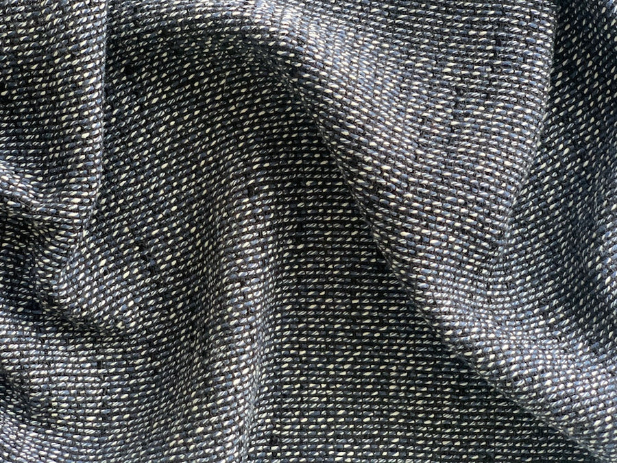 A drapy cotton blend bouclé in denim blue, black, and white - with its soft hand, this bouclé is perfect for a jacket, summer suit, or classic dress. Made in Italy and used by a high-end New York design house. 53% viscose, 23% cotton, 20% polyester, and 4% nylon blend. 58" wide.