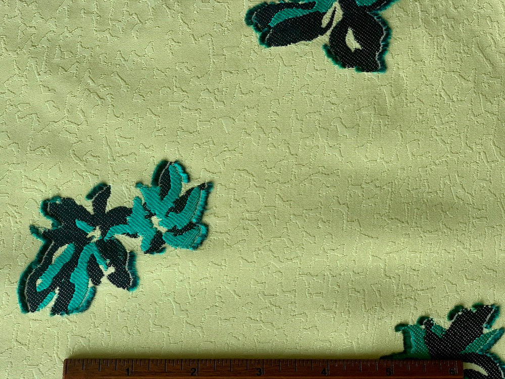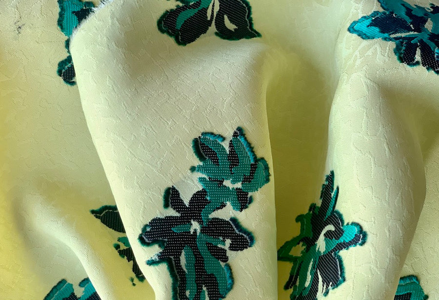 A viscose blend brocade in a mock appliqué floral in shades of emerald green and black on a sunshine yellow background - perfect for a sheath dress, a jacket, or a wrap. Made in Italy. 68% viscose and 32% polyester blend. 56" wide.