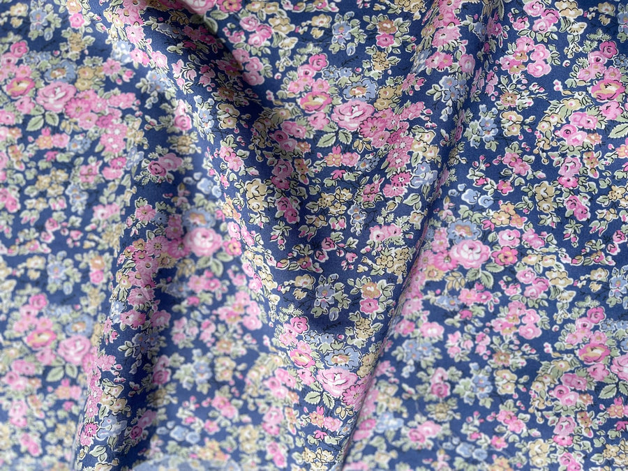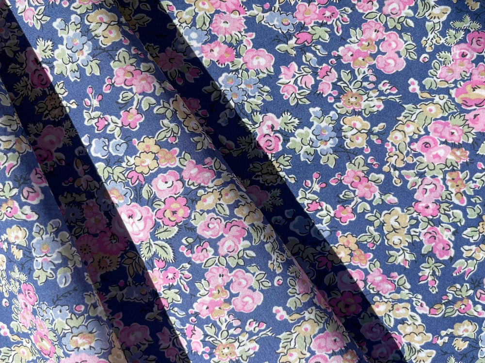 A luxuriously soft cotton lawn from the iconic English company, Liberty of London - Tatum is a summery open cabbage rose print from 1933. This colorway is in shades of sweet pink, and sage green on a denim blue background.