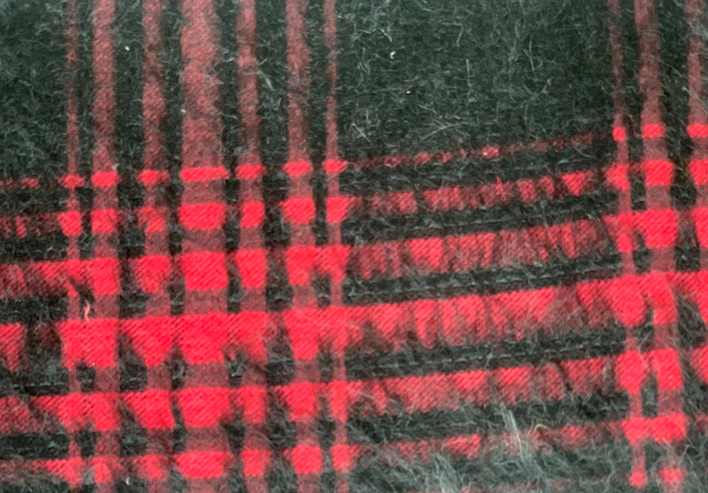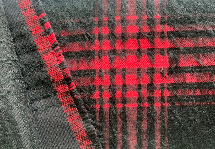 An unusual wool and cotton blend plaid in black and bright red, with a brushed mohair accent - this handsome wool blend plaid has a firm hand and would be perfect for a dramatic long jacket, a coat, or even chic gauchos. Made in Italy. Wool and cotton blend. 58" wide.