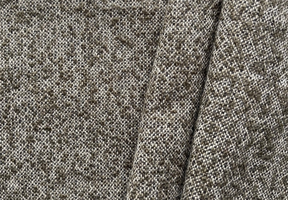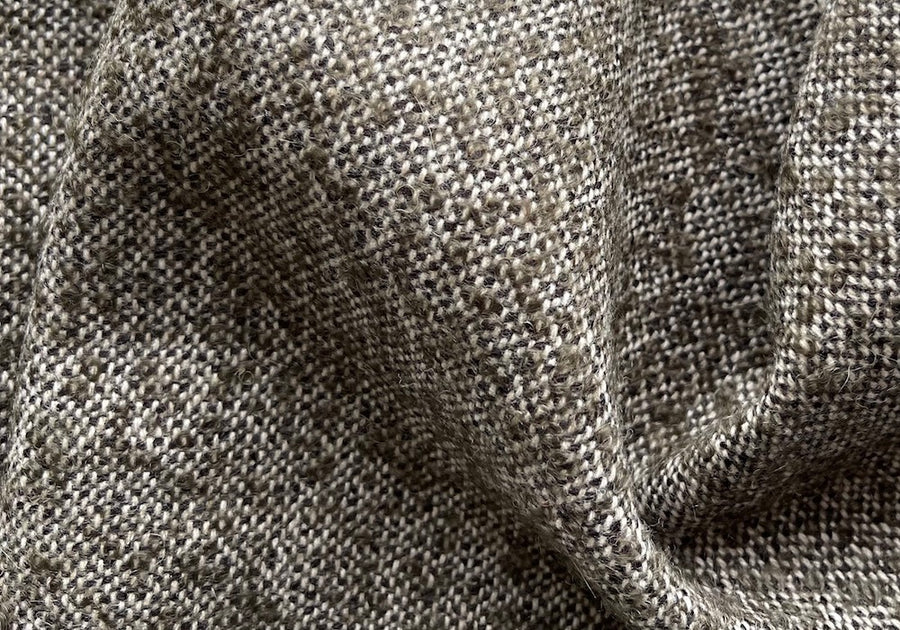 A wool bouclé in shades of autumnal moss and olive green - this soft and supple fabric has playful textural olive tufts, wonderful for skirts, jackets, or dresses. Made in Italy. 100% wool. 62" wide