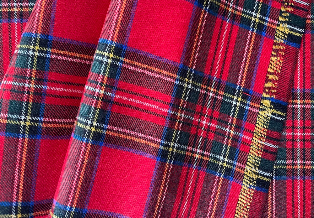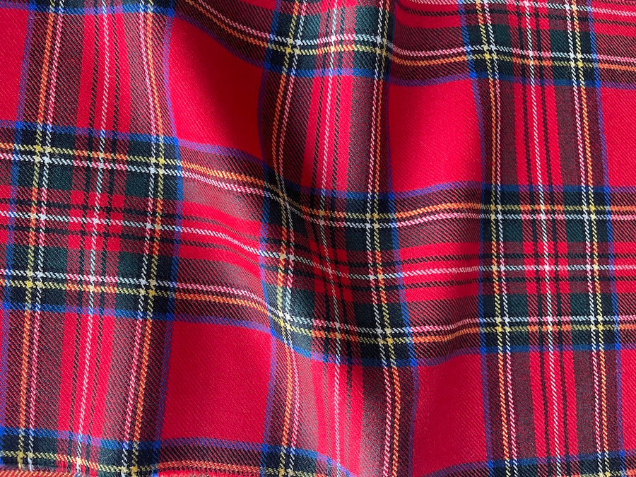 A high-end, selvedged, classic tartan plaid wool twill in vivid shades of scarlet and royal blue, with yellow, black, and white accents - this tightly-woven twill is perfect for skirts, cropped pants, jackets, capes...and of course, kilts. Made in Italy. 100% wool. 60" wide.