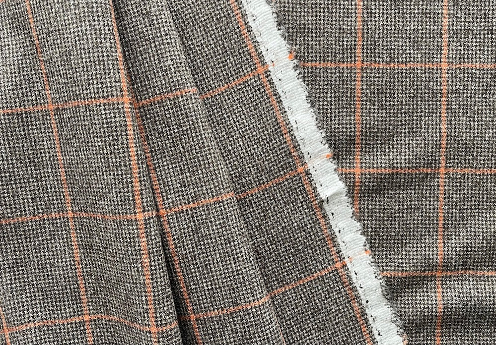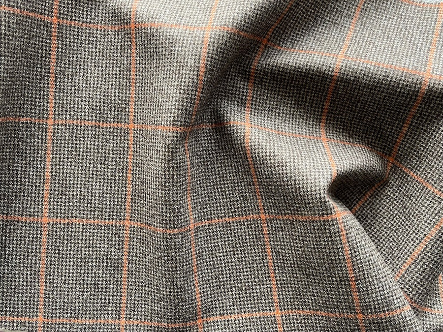 A wool flannel in a handsome walnut brown and apricot plaid check - this soft, mid-weight wool flannel is perfect for tailoring including slacks, a sheath dress, a jumper, or a jacket. Made in Italy. 100% wool. 62" wide.