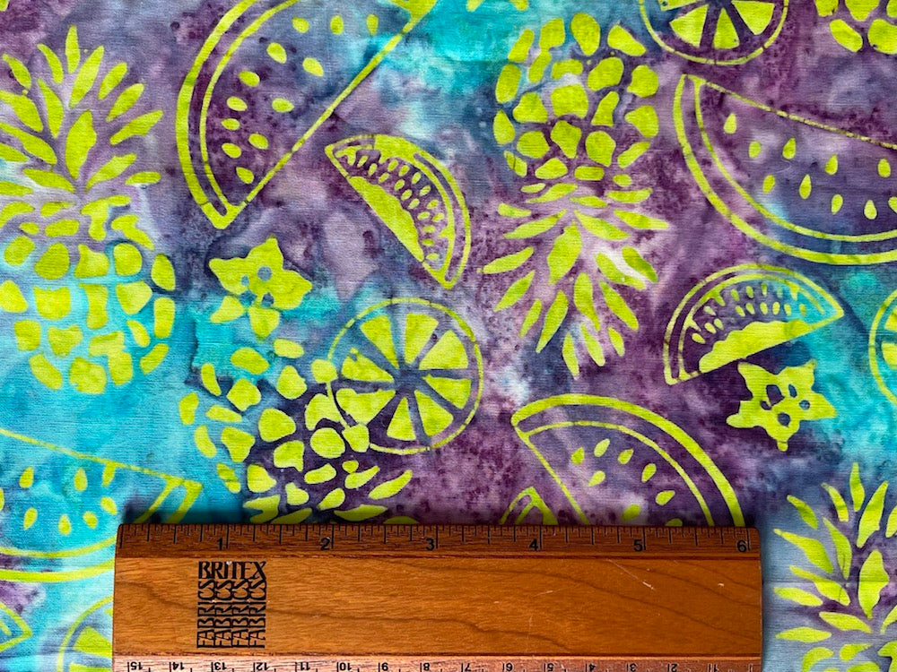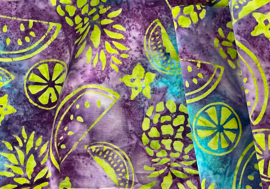 A tightly woven, soft cotton batik, with a poplin hand and in a print of summery chartreuse fruits on a violet and turquoise background. Batik is an ancient wax resist fabric dyeing technique, often resulting in colors with uniquely shaded effects. This batik washes beautifully in cold water and is perfect for quilting, garments, table linens, and home decor -- great for a cabana shirt, a sundress, or a pool wrap! Made in Indonesia. 100% cotton. 45" wide.
