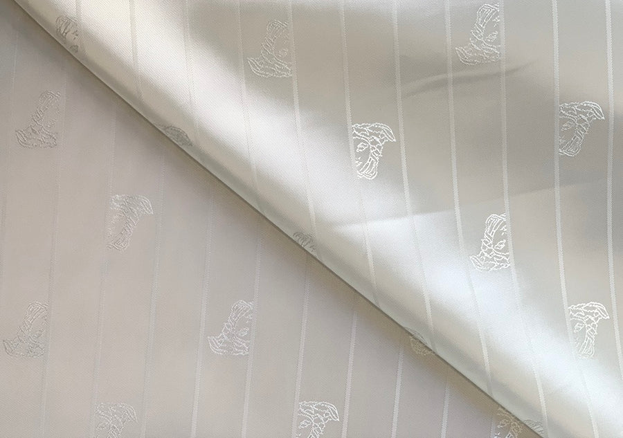 Valentino white jacquard rayon bemberg lining, with the Valentino insignia. Rayon Bemberg linings are our favorite lining. They are cool to the touch, smooth and non-clingy, and washable. Made in Italy for Valentino. 100% rayon bemberg. 56" wide.