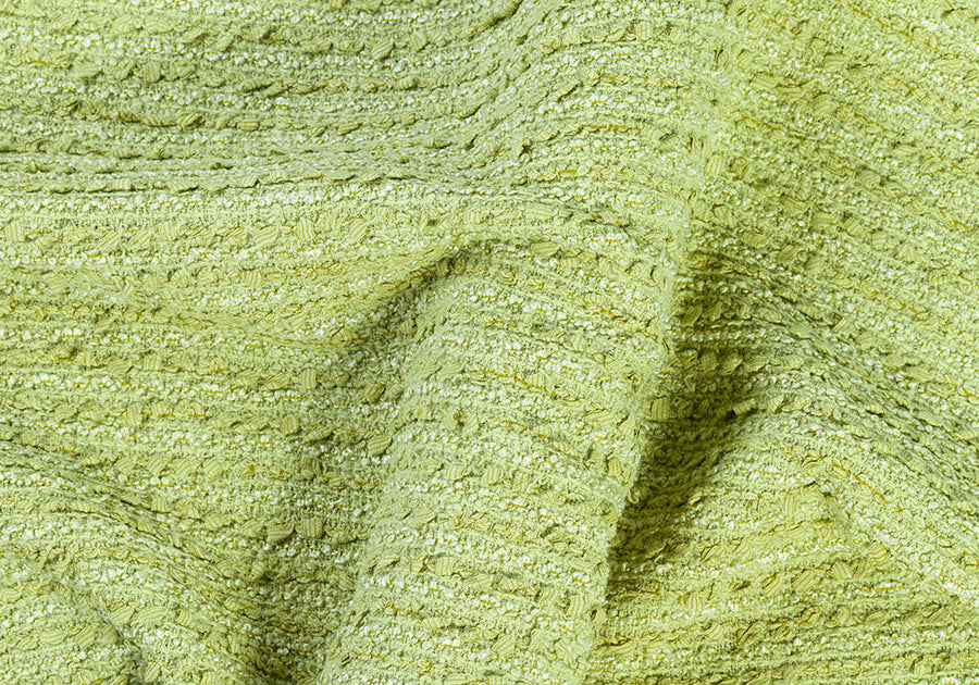 A lovely bouclé in cool willow green, with a crosswise striped weave - perfect for a French, high end, couture-style jacket or an elegant little bolero. Made in Italy. 90% cotton and 10% poliamide. 54" wide.