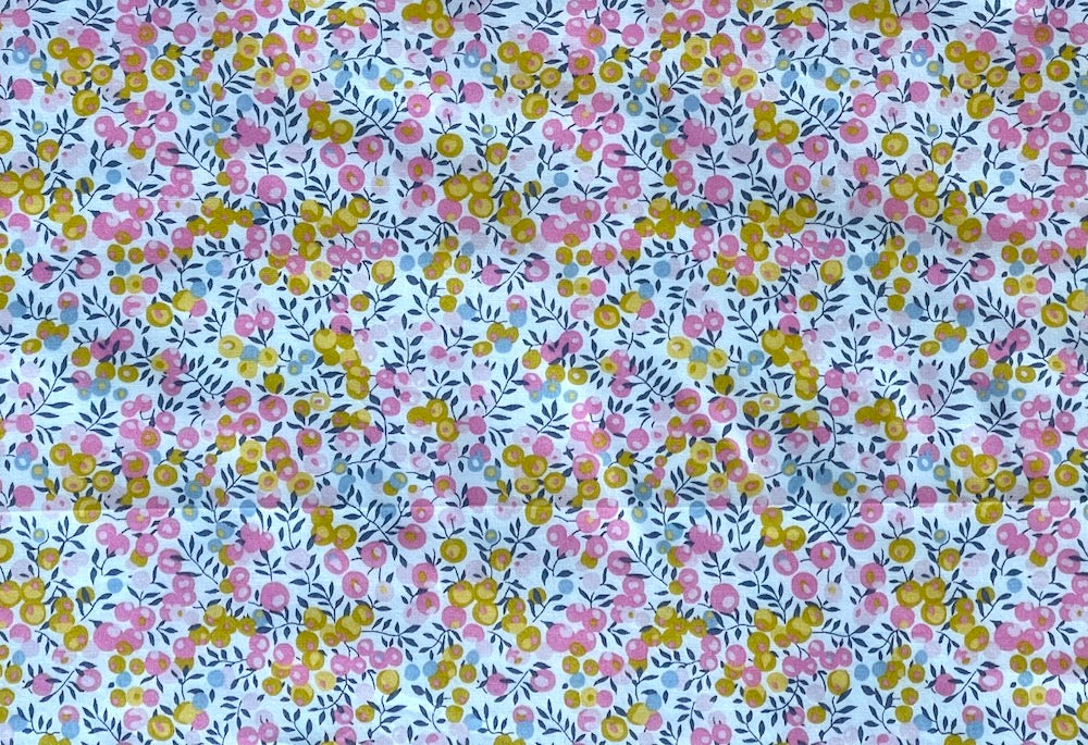 A luxuriously soft cotton lawn from the iconic English company, Liberty of London - Wiltshire is a leaf and berry print from 1933 in shades of sweet pink and butterscotch on a white background.