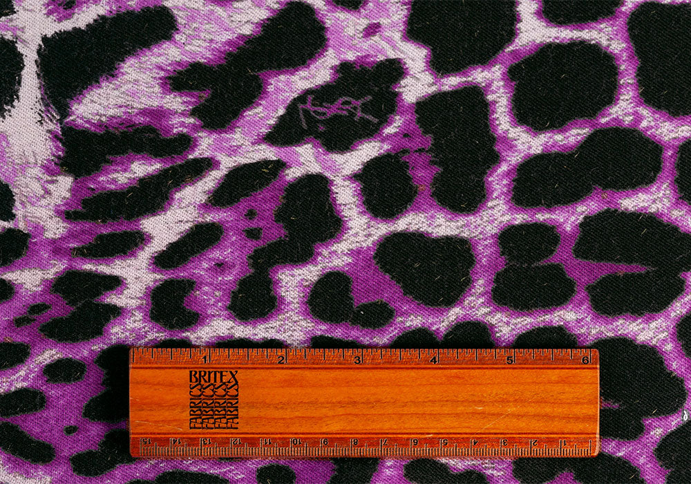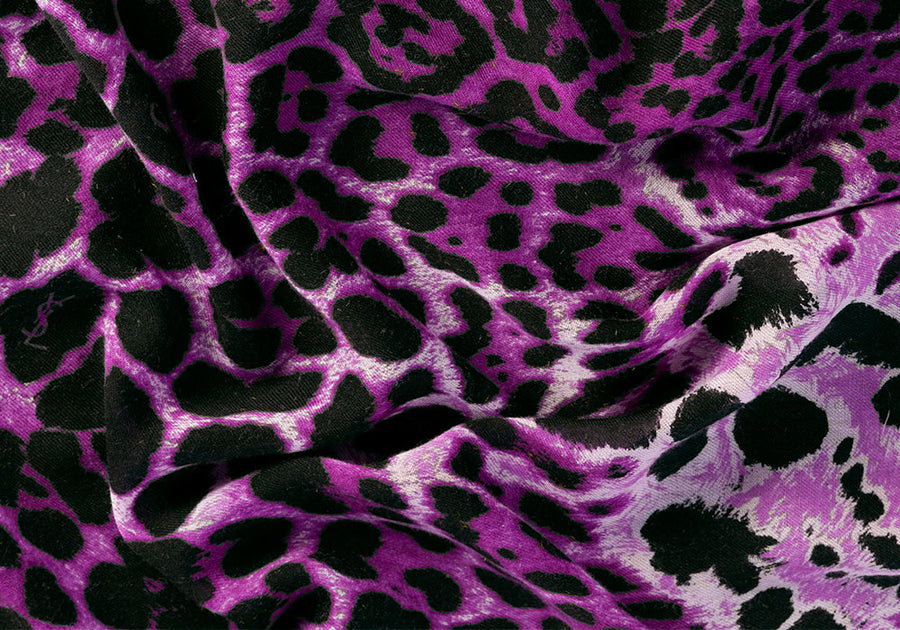 A couture, lightweight, soft, finest wool challis fabric in a large-scale animal print in rich shades of purple - perfect for a full skirt or a wrap top. Signature "YSL" print. Made in Italy. 70% wool and 30% cashmere blend. 55" wide.