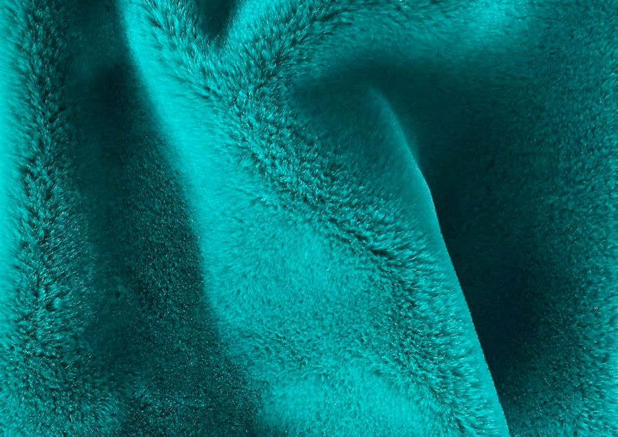 A high-end, dense. plush polyester blend fun fur in vibrant tantalizing teal green - this luxurious faux fur is perfect a show-stopping car coat, a bomber jacket, or a 3/4 length evening coat. Made in Italy. Polyester and acrylic. 57" wide.