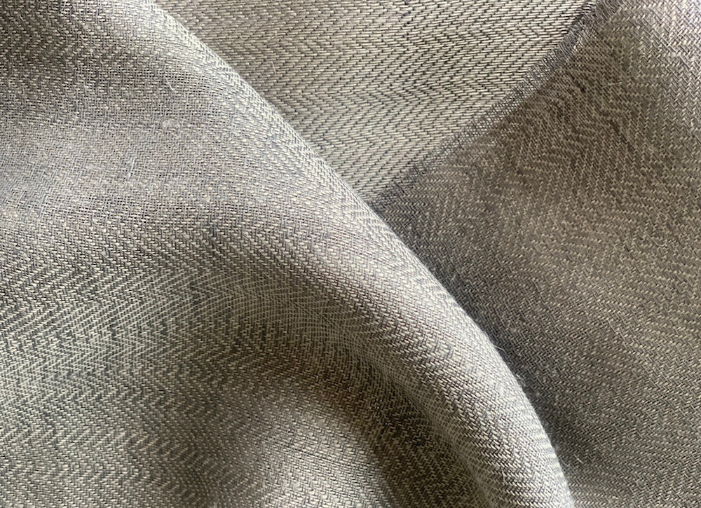 An extra wide linen in a slate grey and flax irregular herringbone weave - soft, but with plenty of body, this fine linen is great for tablecloths, drapes, garments, or pillows. Made in Belgium. 100% linen. 116" wide.