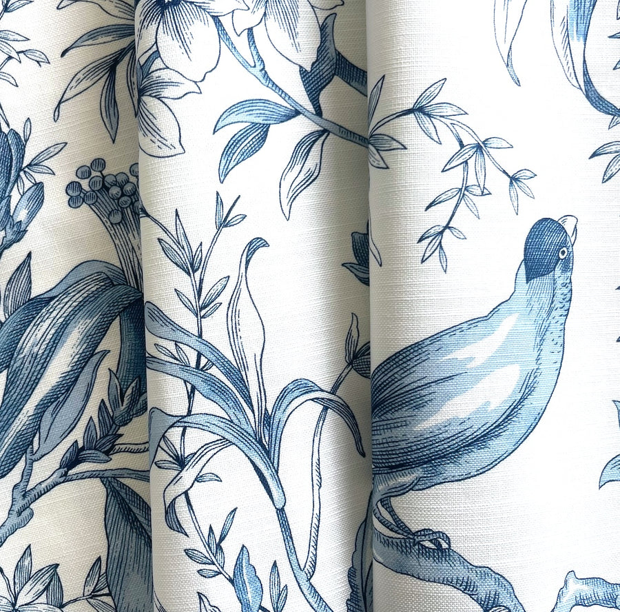 A mid-weight cotton toile of birds perched on tree branches and flowers on a white background - this charming cotton is perfect for drapes, accent pillows, and duvet covers. Made in India. 100% cotton. 55" wide.