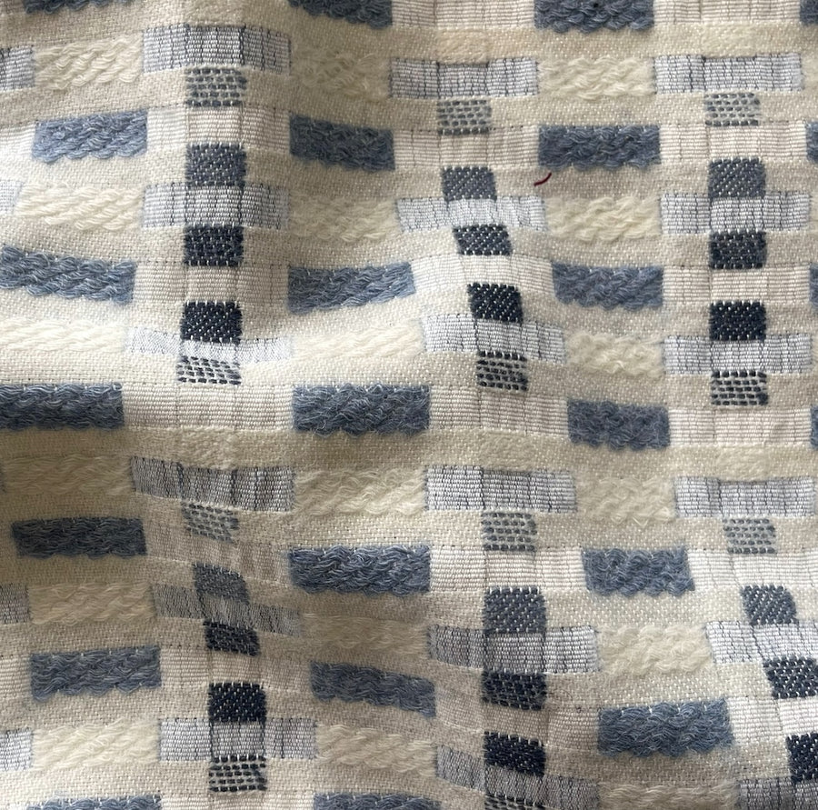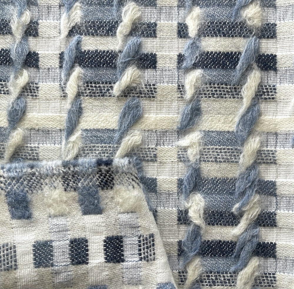 A charming, reversible wool blend upholstery fabric with a cavorting geometric print in shades of denim blue, natural, and off-white, reversing to textured tufts in the same color scheme - modern and unique, this is perfect for pillows, chairs, ottomans, and headboards. From our favorite mill in Turkey. 59% wool, 25% cotton, and 16% acrylic. 53" wide.