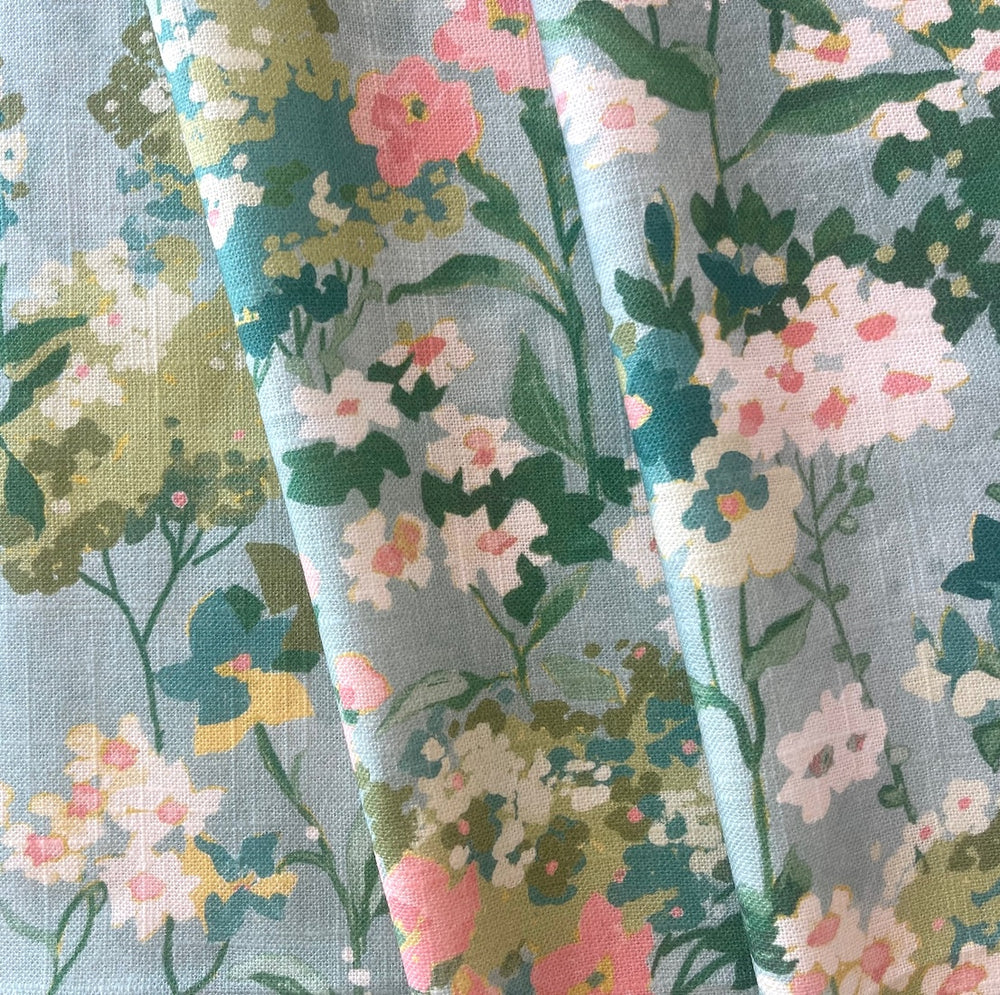 A romantic linen blend in a ballet pink and white all-over floral print on a hazy sky blue background - this mid-weight linen is perfect for drapes, accent chairs, or pillows. Made in England. 55% linen and 45% rayon viscose. 54" wide.