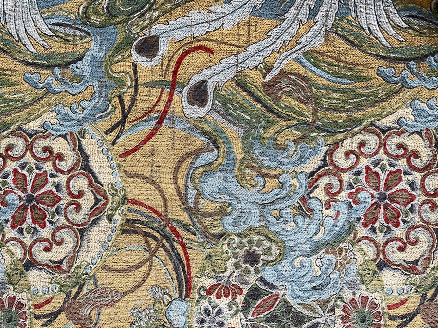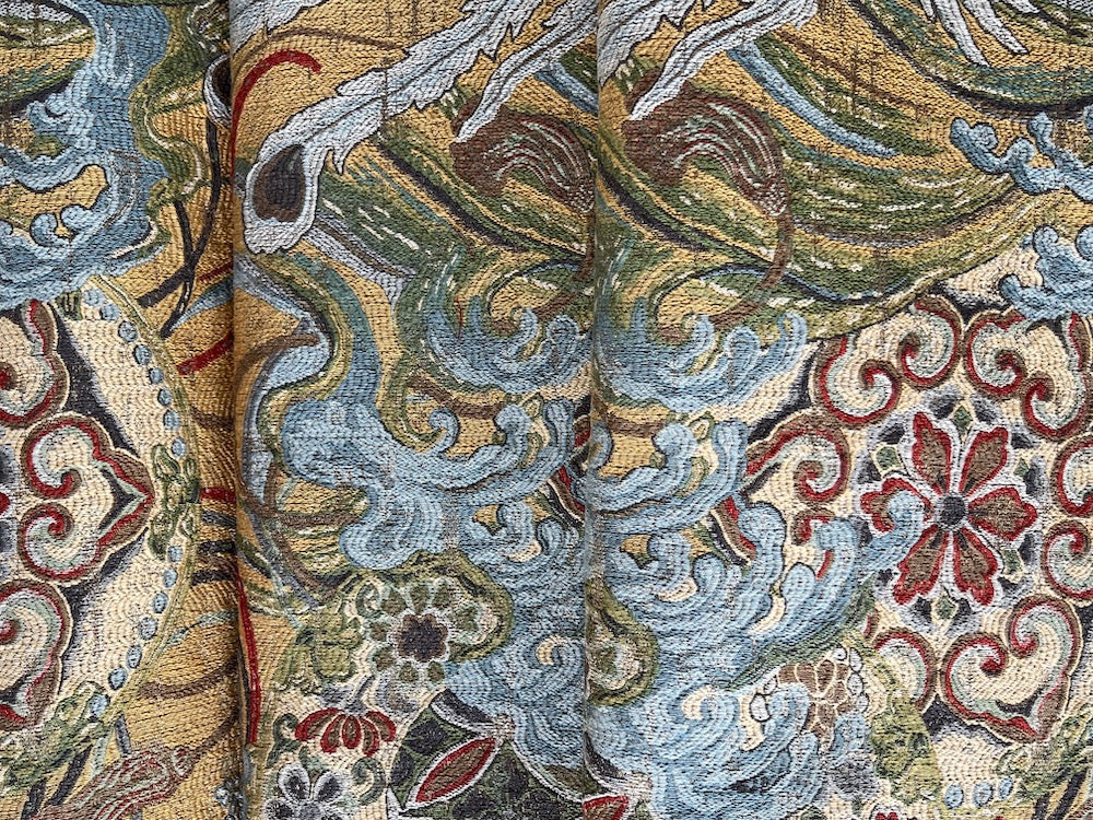 A heavy-weight rayon viscose blend brocade tapestry in a romantic Bloomsbury-influenced design strewn with peacock feathers, flowers, and waves in shades of denim, carnelian, earth, winter white, metallic old gold, and curry - this fantastical fabric would make fabulous boudoir chairs, ottomans, headboards, drapes, or accent pillows. Made in Turkey. 83% rayon viscose and 17% polyester. 54" wide.