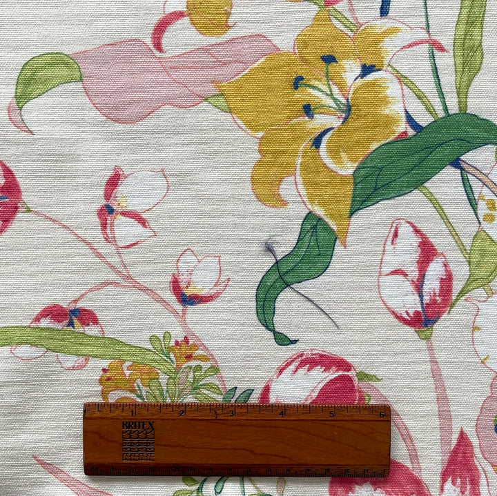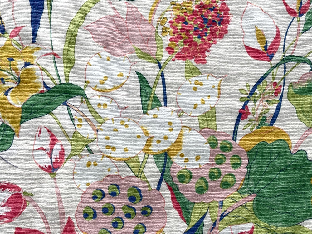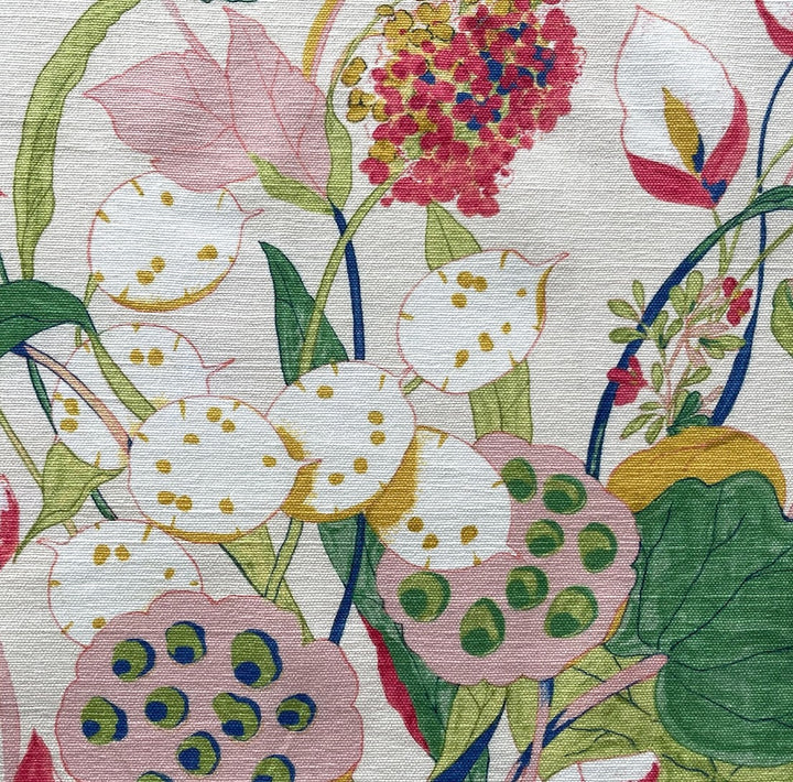 A mid-weight linen blend canvas in a print of lotus blooms and pods along with lilies in primary shades of grass green, soft lime, coral, and mustard on a natural-colored background - this cotton canvas is perfect for drapes, accent chairs, duvet covers, totes, or pillows. Made in Spain. 55% linen and 45% cotton. 54" wide.
