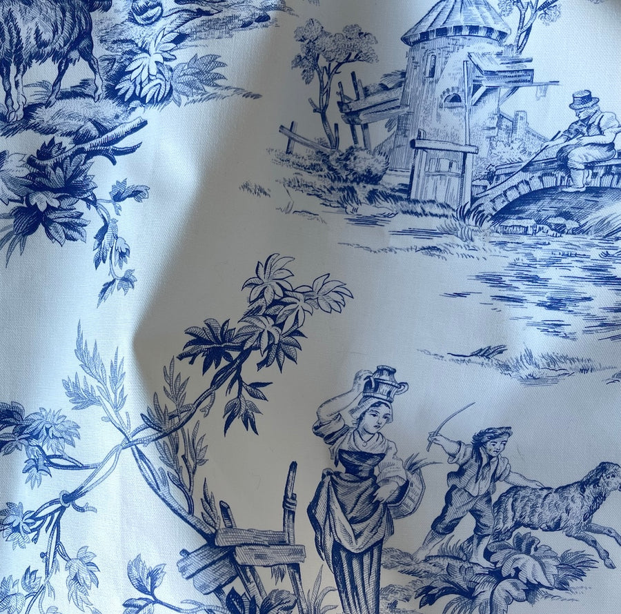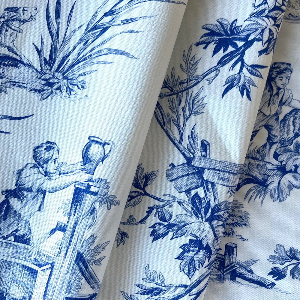 A mid-weight cotton canvas toile de jouy in a traditional cobalt blue pastoral print of people, farm animals, and dogs frolicking in summer meadows on a bright white background - this print is perfect for pillows, Roman shades, slipcovers, or draperies. Made in USA. 100% cotton. 54" wide.