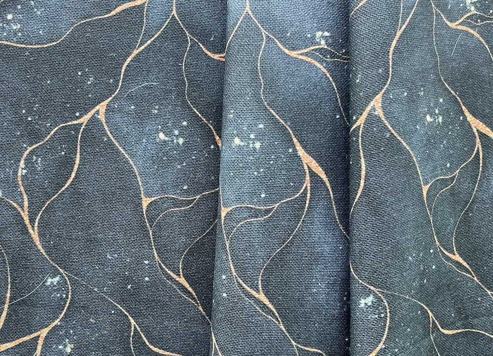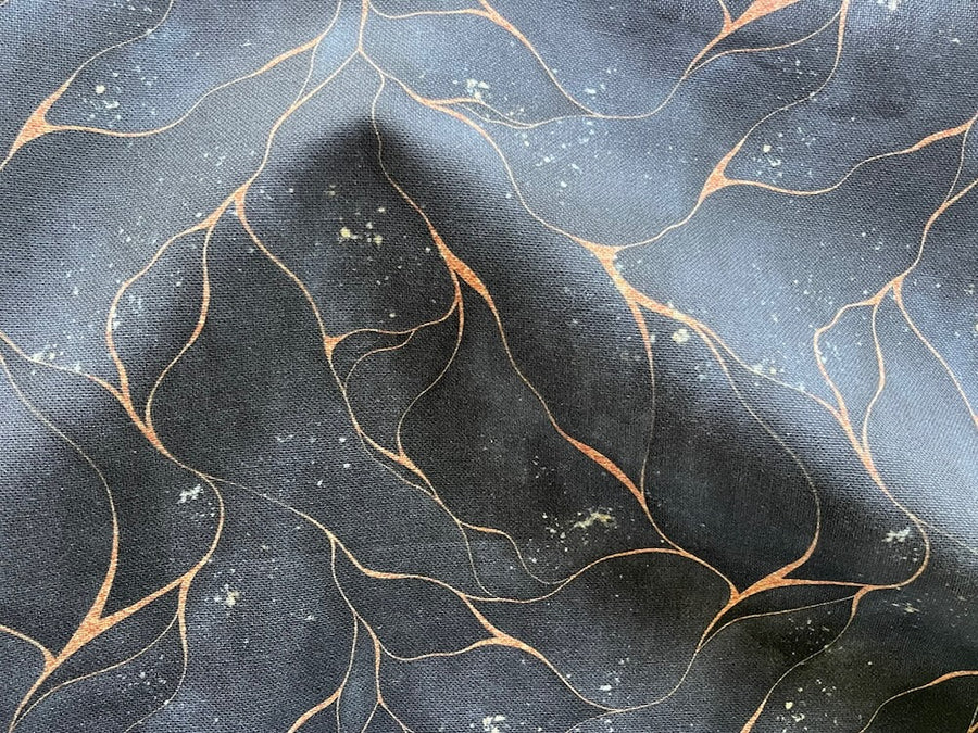 A mid-weight sturdy cotton canvas in a print of copper veins on a granite grey background - this cotton canvas is perfect for jeans, a tote, pillows, or a trucker jacket. Made in the Netherlands. 100% cotton. 56" wide.