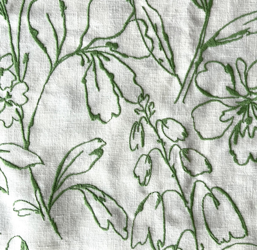 A mid-weight cotton blend home decorating fabric embroidered with delicate wildflowers in spring green on a natural colored background - this subtly textured cotton blend is perfect for curtains, headboards, accent pillows, and ottomans. 52% cotton and 48% polyester. 55" wide.