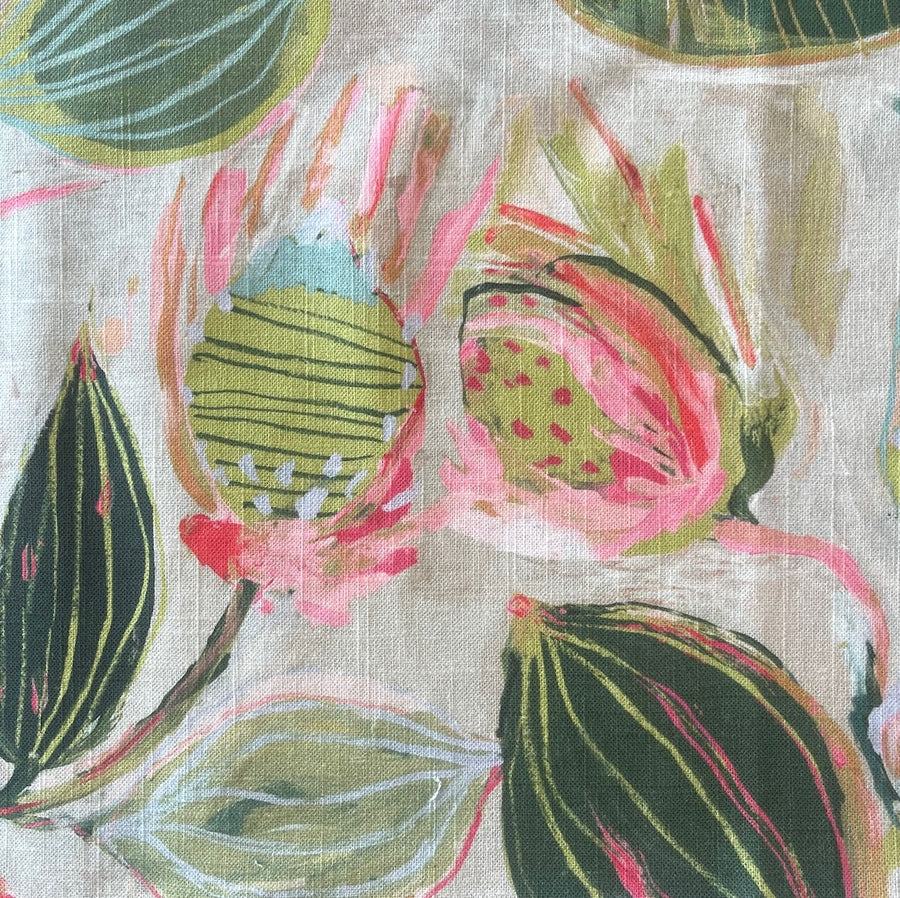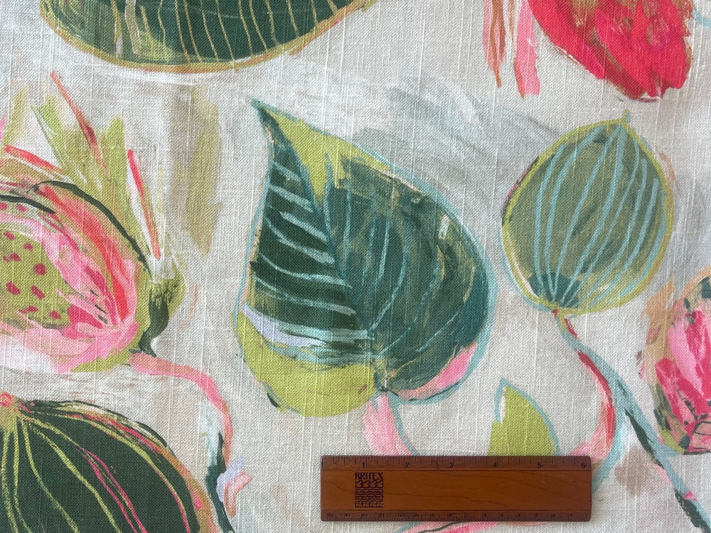 A lovely linen blend in a flamingo pink and seaweed green tropical pod and floral print on a natural background - this mid-weight linen is perfect for drapes, accent chairs, or pillows. Made in England. 55% linen and 45% rayon viscose. 54" wide.