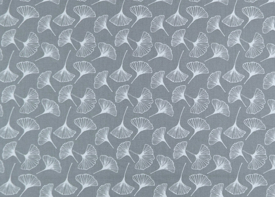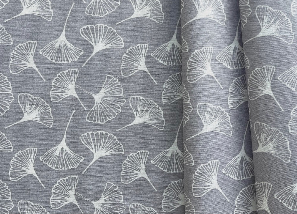 A water-resistant, laminated cotton in a subtle print of falling ginkgo leaves on a steel grey background - practical, wipeable, and handsome, this laminated cotton is perfect for bags, totes, tablecloths, sit-upons, and cushion covers. Made in France. 100% cotton with lamination. 62" wide.