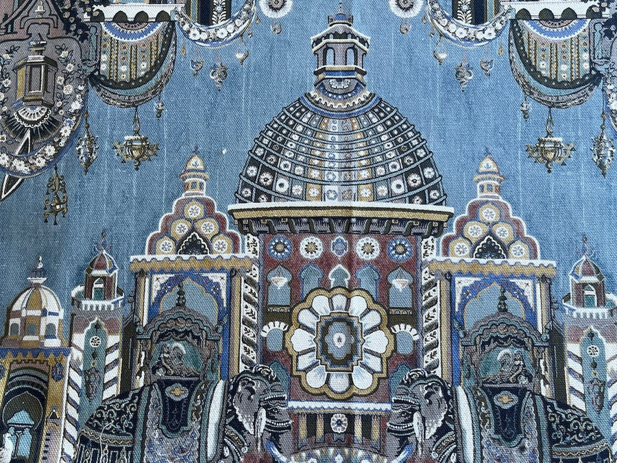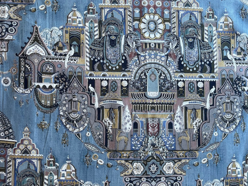 A mid-weight cotton canvas print of a heavenly Indian paradise with albino peacocks, elephants, and gazelles in shades of cerulean and grey - this large-scale print would be lovely for chairs, ottomans, roman shades, headboards, and accent pillows. 100% cotton. 55" wide.