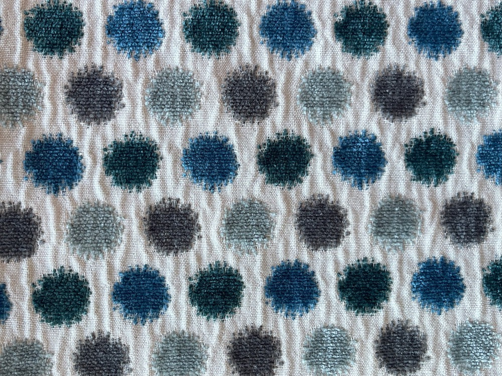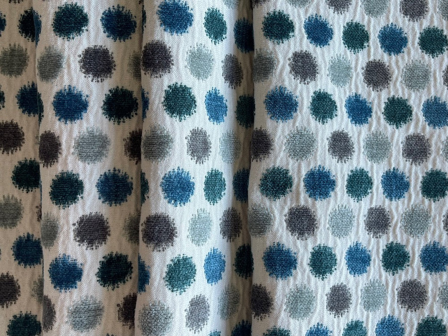 A high-end textured cotton and rayon blend covered with staggered rows of velvet dots in calm watery shades ranging from sea foam, to teal, to ocean blue, to storm cloud grey on a neutral natural background - this stunning fabric would be great for dining room chair seats, headboards, or pillows. Cotton, rayon, and polyester. 57" wide.