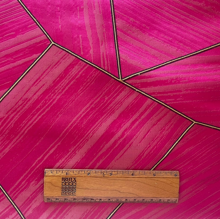 A sturdy polyester blend in a hot pink geometric print that's reminiscent of road maps with yellow and black accents - this mid-weight home dec fabric is perfect for drapes, accent chairs, or pillows. 48% polyester., 27% nylon, and 25% cotton. 56" wide.