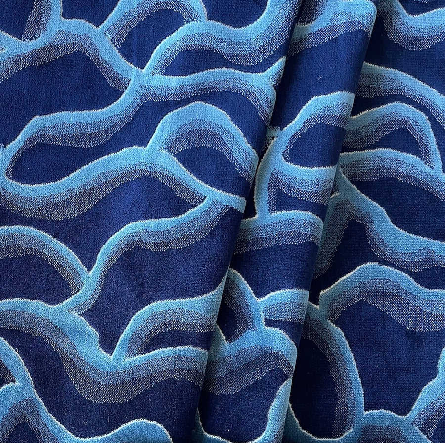 An elegant plush of rayon viscose blend velvet in a design of deep ocean swirling shapes in rich shades of denim and navy - this heavy-weight velvet is perfect for drapes, accent chairs, duvet covers, headboards, or pillows. Made in India for Kravet. 63% rayon viscose and 37% polyester. 58" wide.
