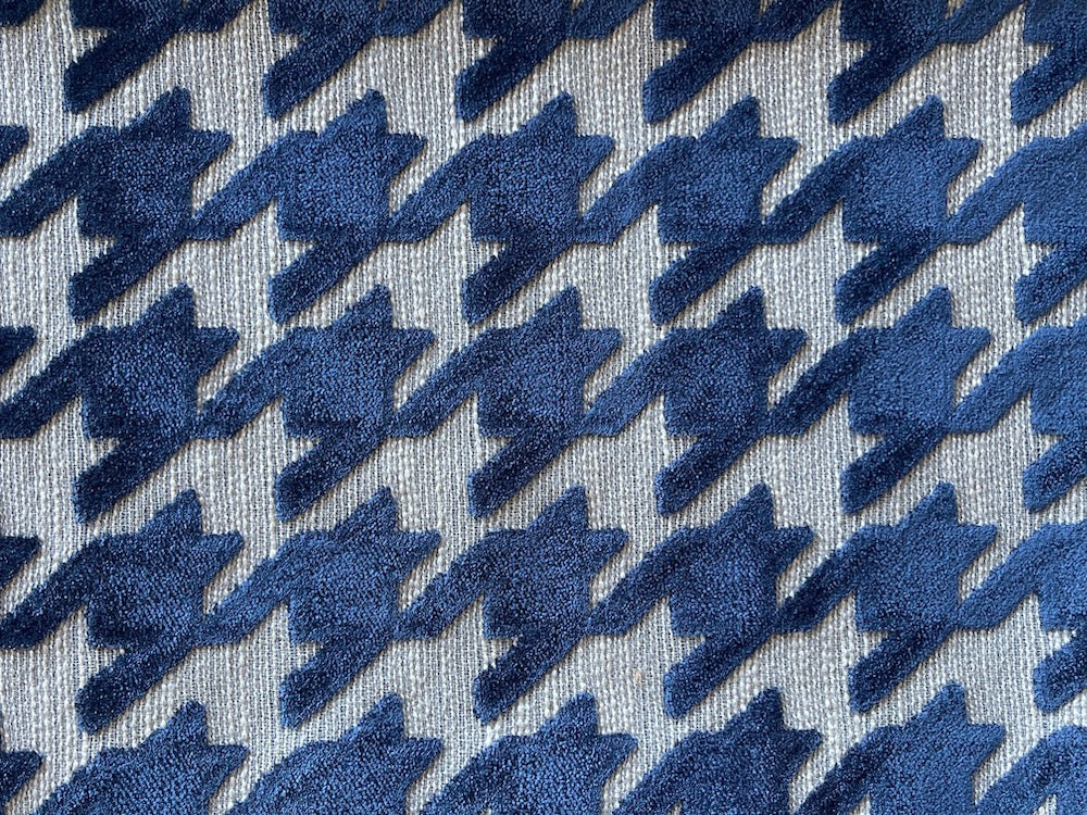 A  polyester blend with mammoth space blue velvet hounds-tooth design on a textured fog grey background -  this menswear-influenced fabric would be handsome for upholstery, headboards, chairs, and ottomans. 68% rayon and 32% polyester. 57" wide.