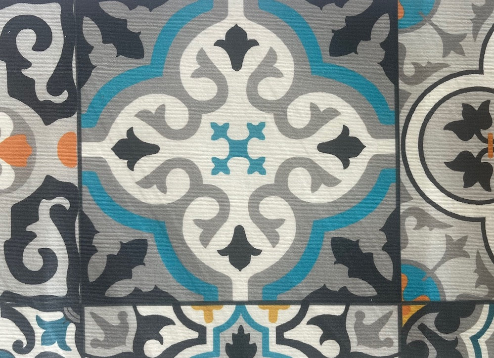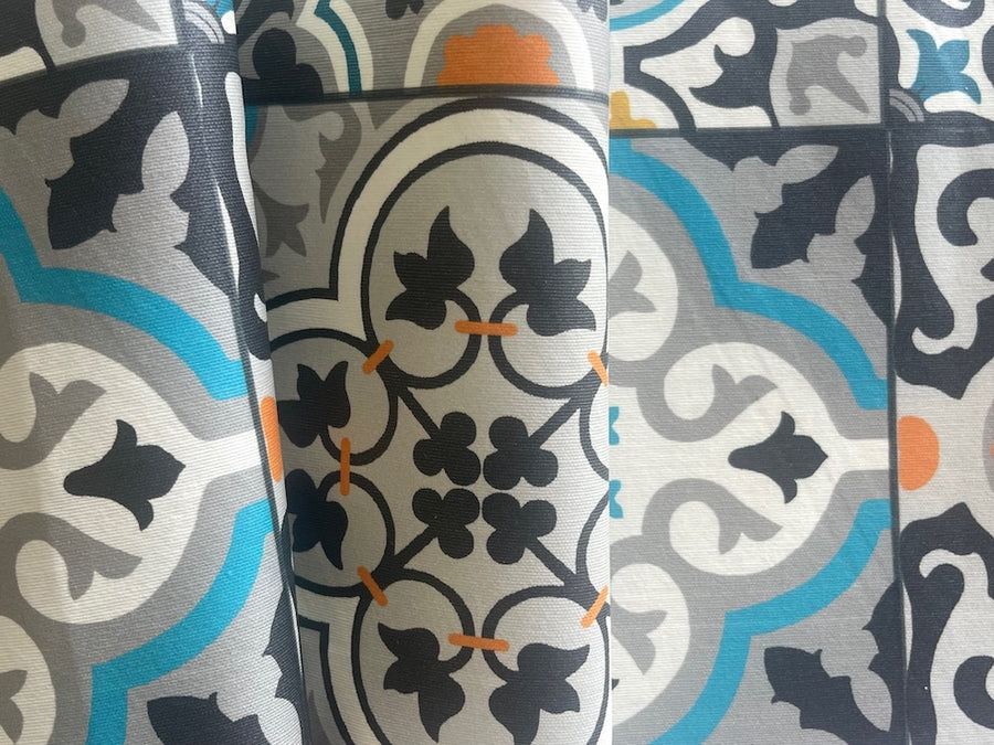 A water-resistant, laminated cotton in a sophisticated print inspired by Moroccan tilework in shades of turquoise, tangerine, black, and gray - practical, wipeable, and handsome, this laminated cotton is perfect for bags, totes, tablecloths, sit-upons, and cushion covers. The back side may be ironed. Made in Spain. 100% cotton with lamination. 54" wide.