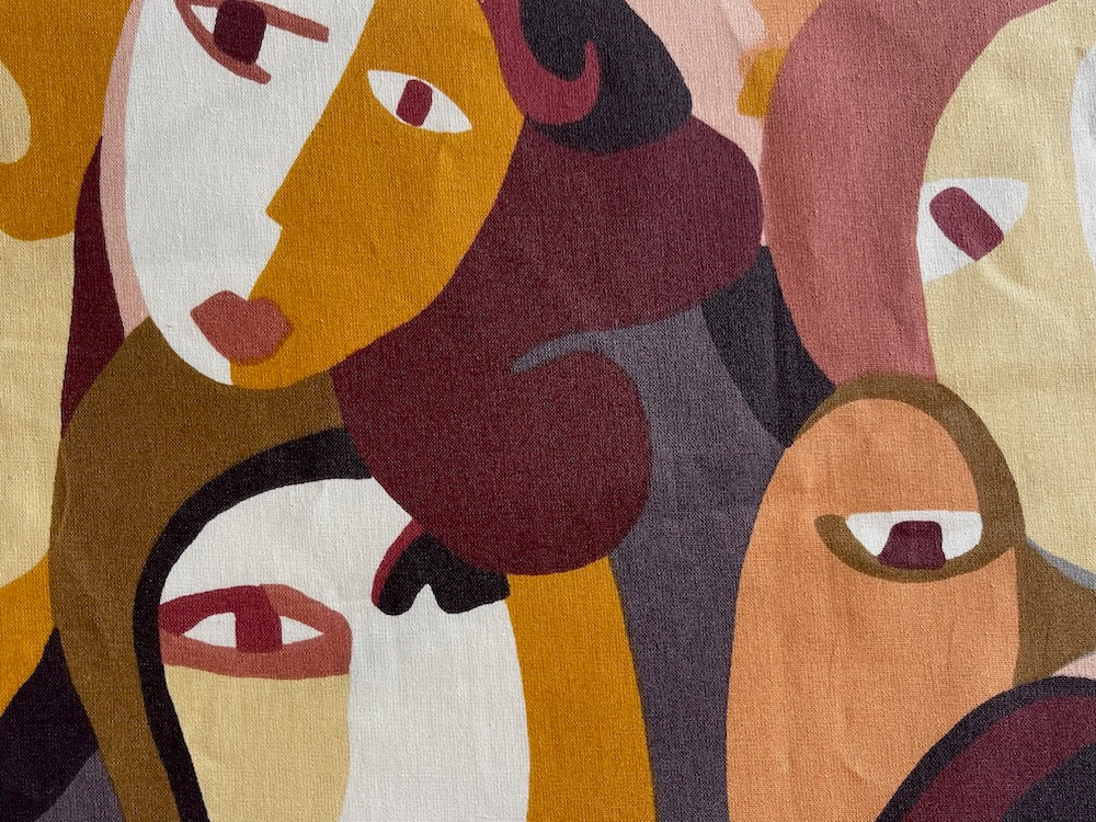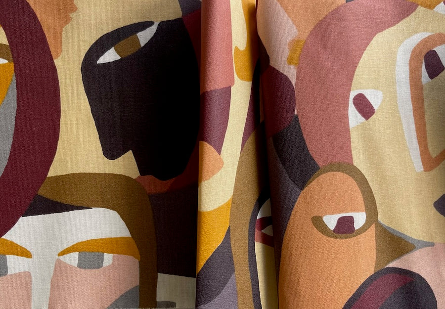 A water-resistant, laminated cotton in a print of painterly faces in shades of ocher and sienna, and beige - practical, wipeable, and handsome, this laminated cotton is perfect for bags, totes, tablecloths, sit-upons, and cushion covers. Made in France. 100% cotton with lamination. 62" wide.