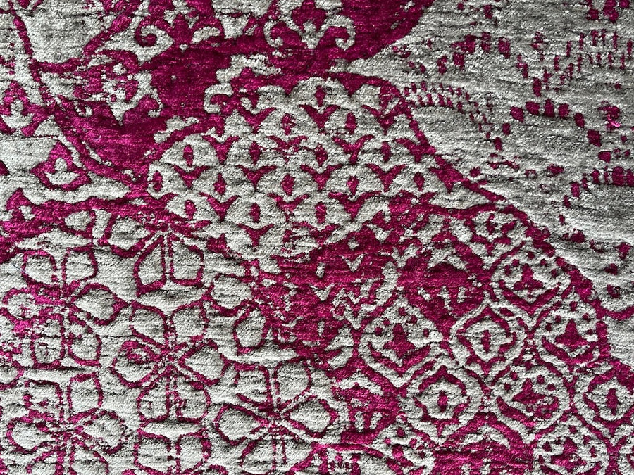 A high-end, mid-weight chenille velvet upholstery fabric in a zesty fuchsia Arabesque tilework pattern on a fog grey background - inviting and plush, this soft velvet is perfect for upholstery, headboards, chairs, and sofas. Made in Turkey. 55% rayon, 31% cotton, and 14% polyester. 51" wide.