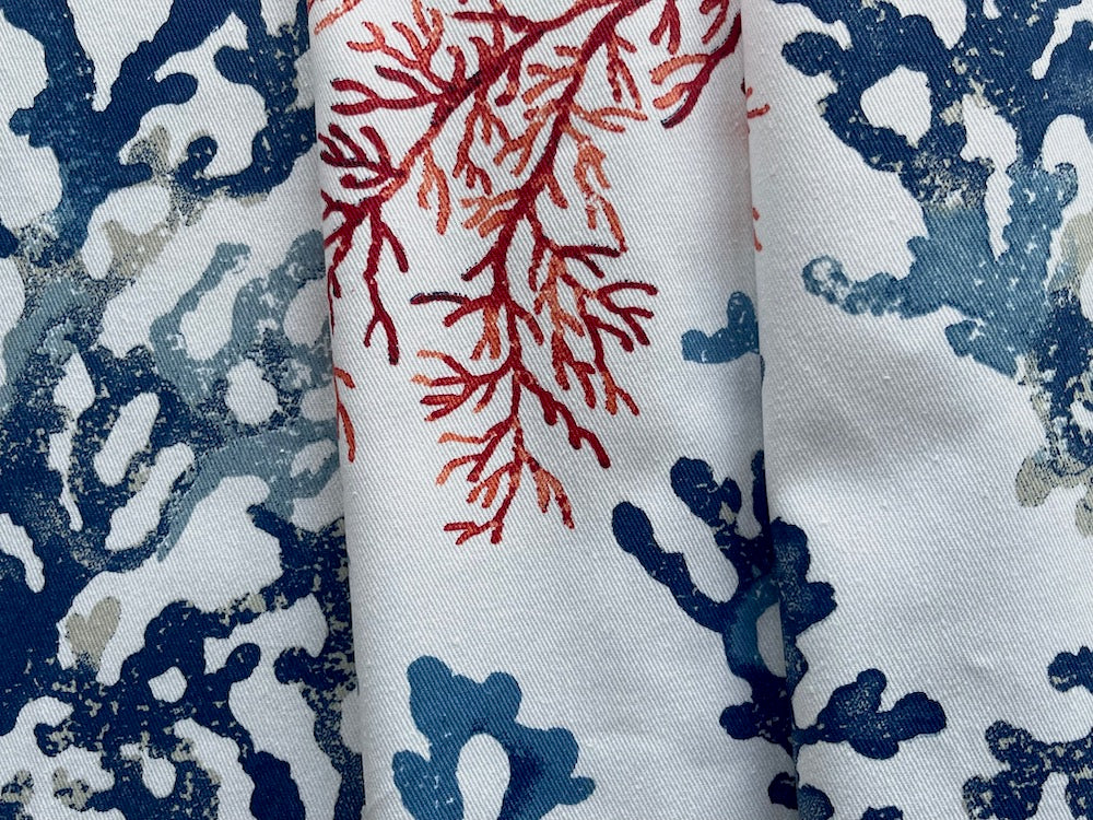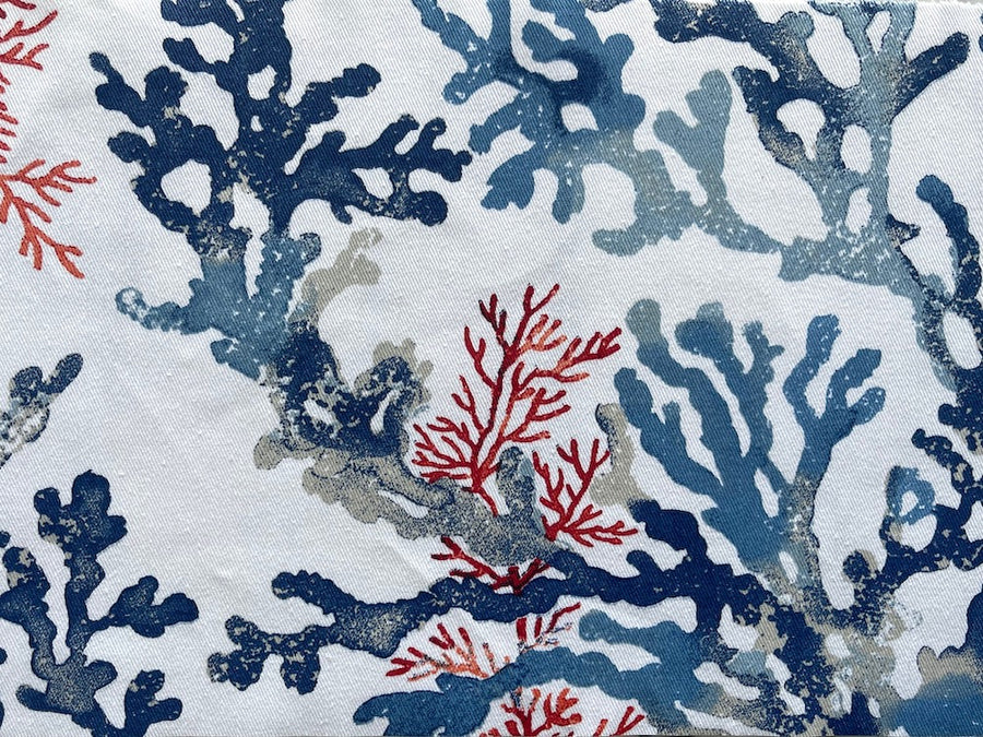 A water-resistant, laminated cotton in a print of graceful swaying coral on a bright white background - practical, wipeable, and handsome, this laminated cotton is perfect for bags, totes, tablecloths, sit-upons, and cushion covers. Made in France. 100% cotton with lamination. 62" wide.