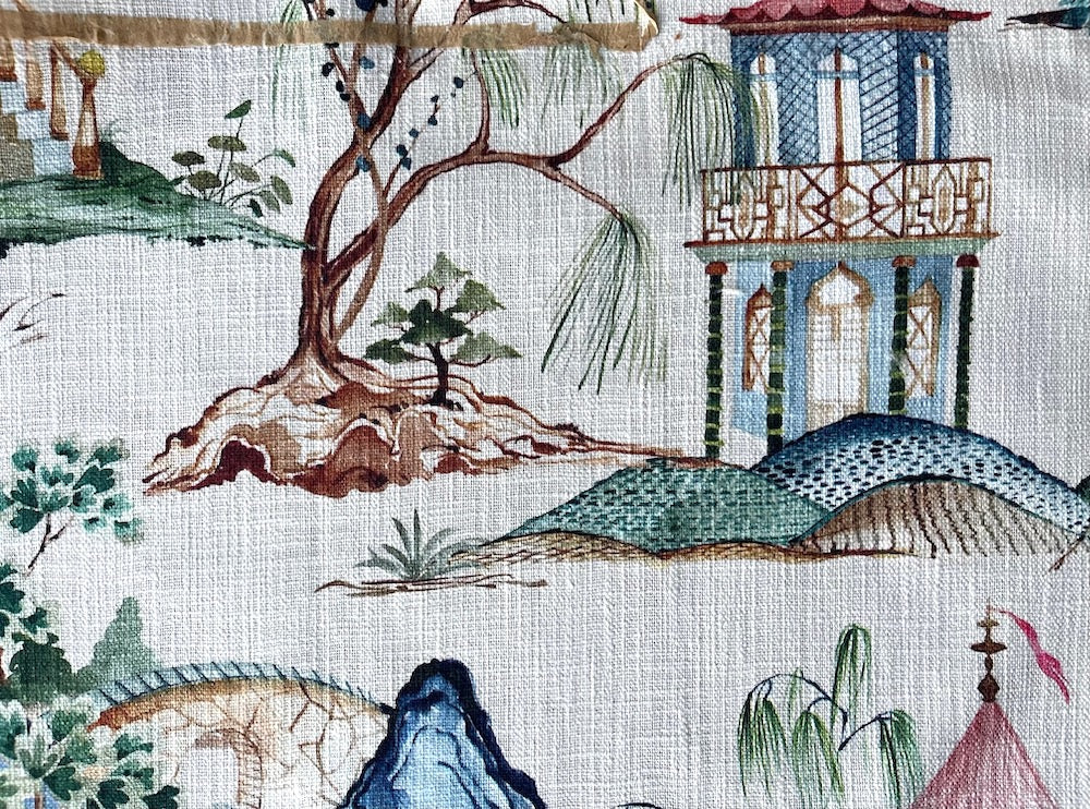 A mid-weight cotton mock bark cloth in a charming Asian-inspired toile countryside print in delicate shades of ocean blue, navy, rose, chestnut brown, camel, pine and sage on a natural off-white background - this whimsical toile is perfect for drapes, pillows, and light weight upholstery. Made in India. 100% cotton. 58" wide.