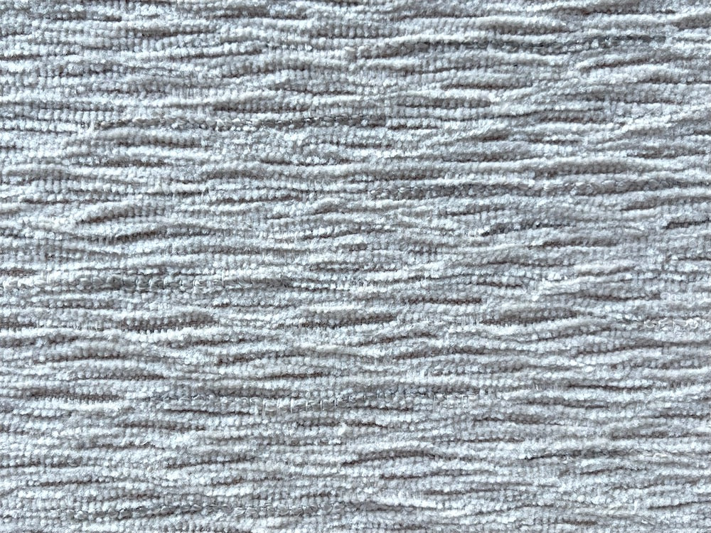 A mid-weight acrylic blend textured chenille in a handsome shade of cool oyster - this modern, matte neutral chenille is perfect for sofas, dining room chairs, sectionals, or covered headboards. Made in India. Acrylic and polyester. 55" wide.