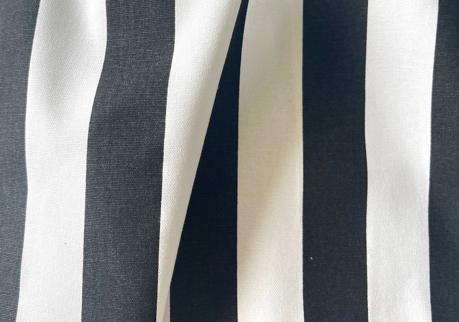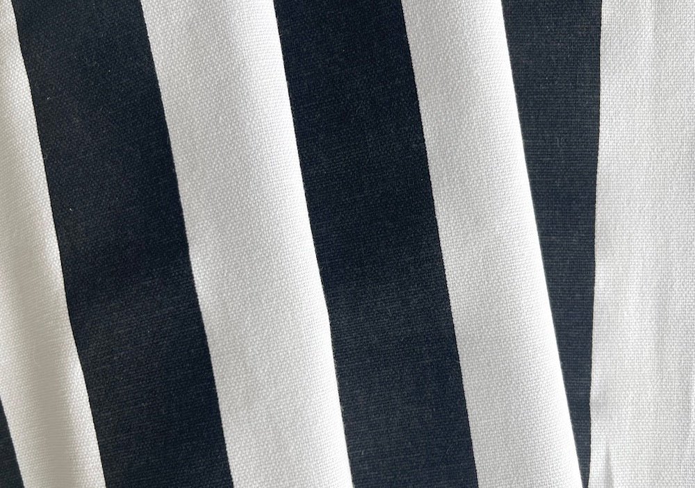 A lighter-weight cotton canvas in a lengthwise black and white 1 1/2" wide stripe - this striking graphic stripe is perfect for gathered skirts, bags, and accent pillows. Made in USA.100% cotton. 56" wide.