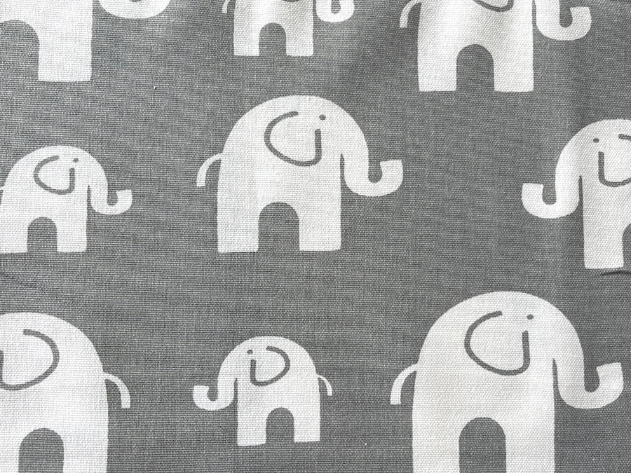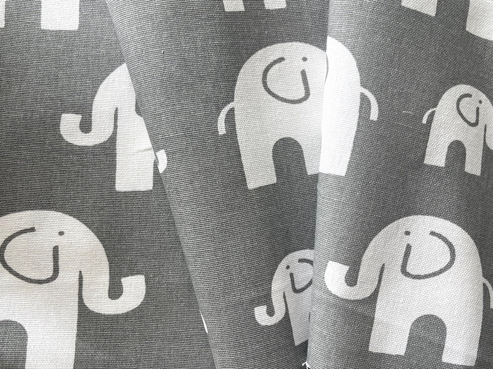A lighter-weight cotton canvas with a sweet herd of white elephants on a pigeon grey background - this graphic print is perfect for gathered skirts, bags, curtains, and accent pillows. Made in USA.100% cotton. 56" wide.
