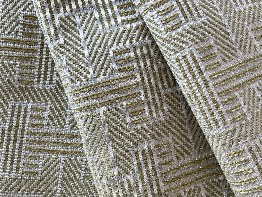 A textured polyester blend in a wheat and ivory columnar basketweave design - sturdy, dye-fast, and durable, this is perfect for covering sofas, chairs, and headboards. 75% polyester and 25% rayon blend. 57" wide.