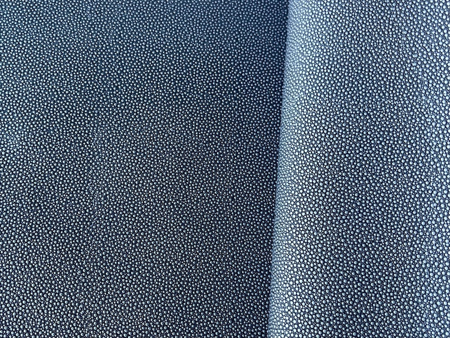 A mid-weight polyester blend imitation leather in a sharkskin-inspired, slate grey, tone-on-tone dot - this sophisticated and well-made imitation leather is perfect for car or home upholstery, headboards, dining room chairs, or ottomans. Wipe down with water. Made in USA. Polyester and urethane. 55" wide.