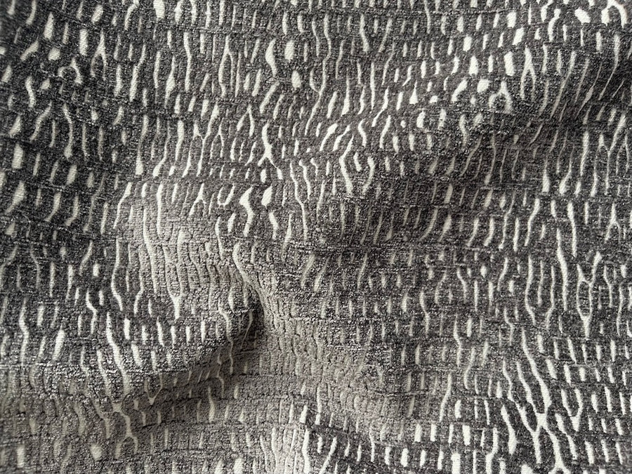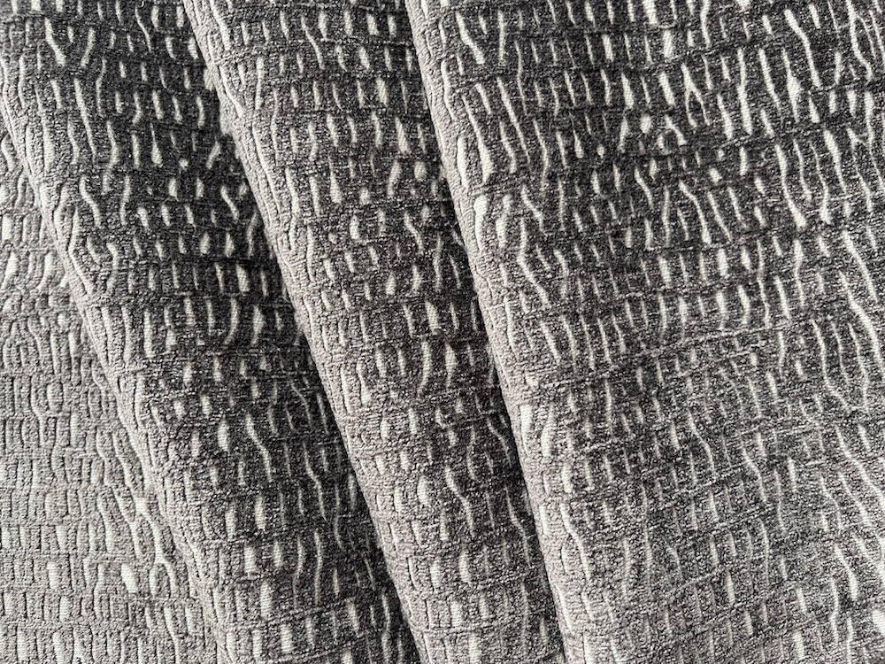 A chenille velvet in sophisticated ash grey and white - soft and durable, this lush chenille is 15,000 double rubs and perfect for sofas, dining room chairs, or covered headboards. Made in India. 53% rayon viscose, 33% polyester, and 14% cotton. 55" wide.
