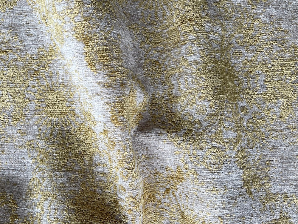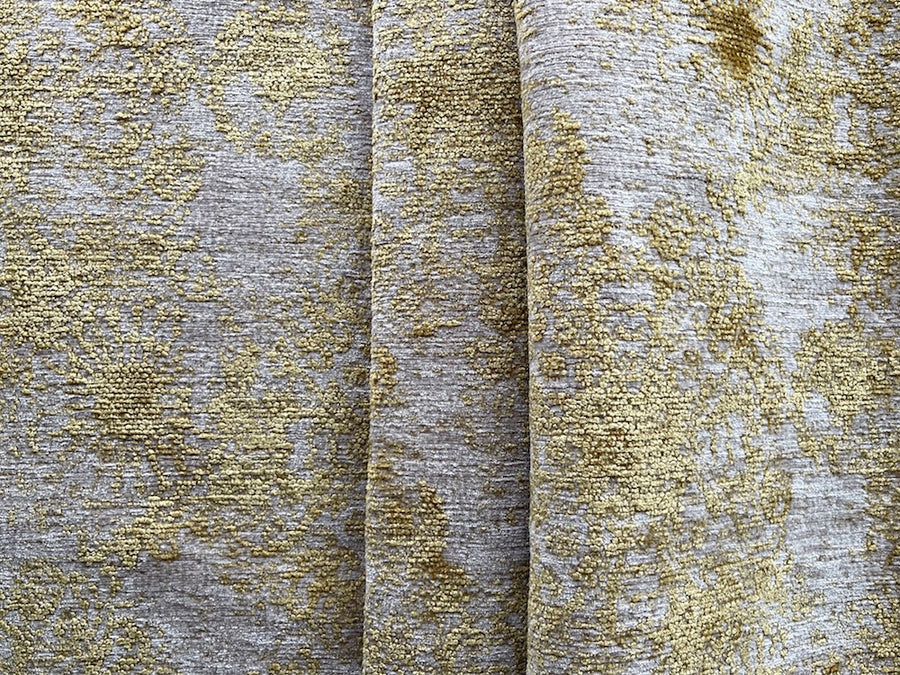 An exquisite, high-end rayon blend velvet chenille in a boho floral non-metallic gold on soft beige design - this sophisticated, dense velvet chenille is perfect for dining room chairs, pillows, ottomans, or other upholstery projects. Made in Turkey. 55% rayon, 25% polyester, and 20% cotton blend. 54" wide.