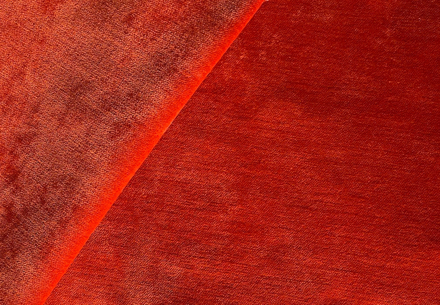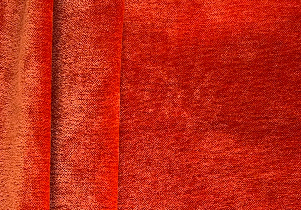 Juicy tangerine orange chenille velvet upholstery fabric. Our favorite chenille upholstery velvet is double-sided. Sumptuously soft and perfect for sofas, chairs, ottomans and coats. Made in Turkey exclusively for Britex.50% acrylic, 41% polyester, and 9% rayon. 55" wide.
