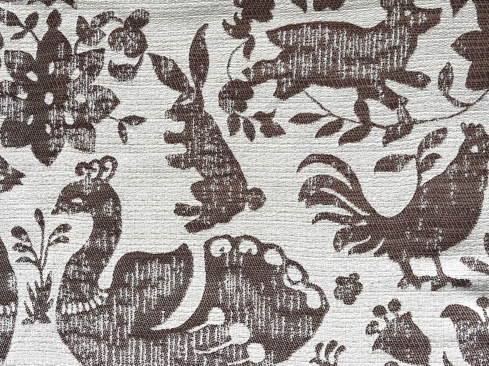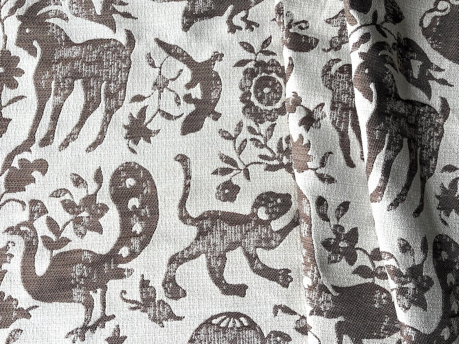 A textured, mid-weight rayon blend fabric in a whimsical print of wenge-colored creatures roaming the landscape on an rice ivory background - with goats, peacocks, bunnies, monkeys, and more, this fabric is perfect for upholstery, accent pillows, drapes, window-seats, occasional chairs, heavy drapes, or headboards. Made in Spain. Rayon, polyester, and acrylic. 57" wide.