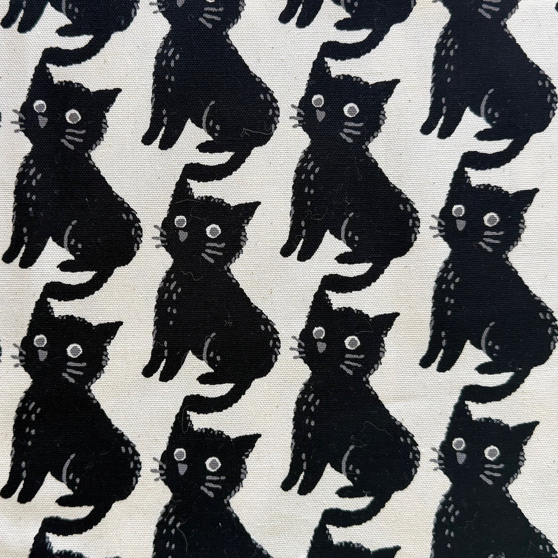 A lighter-weight cotton canvas adorned with wide-eyed black cats with grey whiskers on a natural background - this charming print is perfect for full skirts, blouses, totes, curtains, or aprons. Made in Japan. 100% cotton. 44" wide.