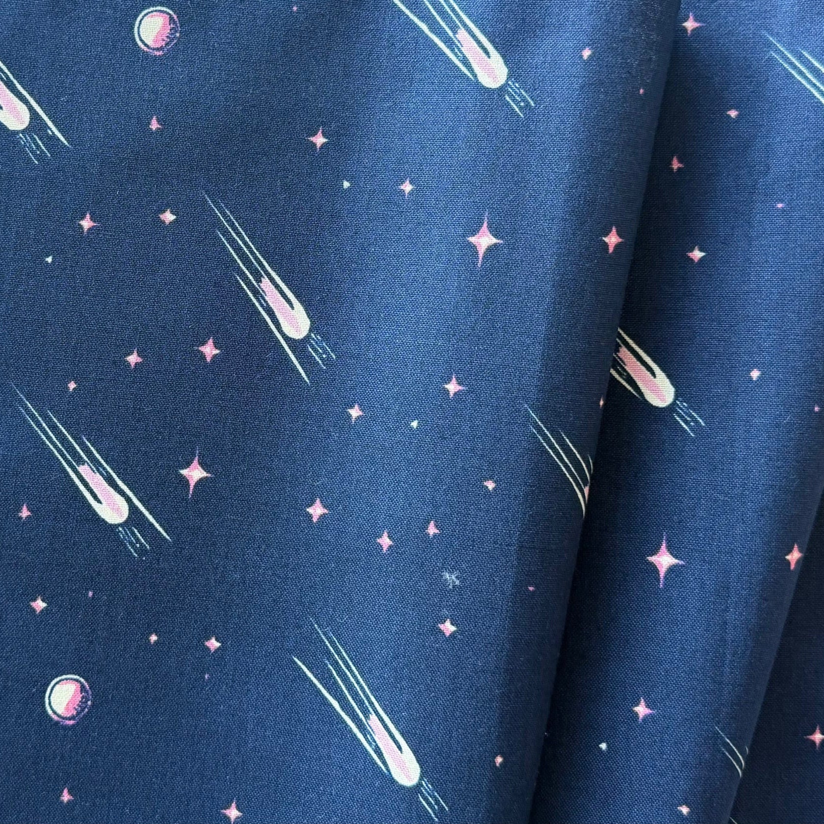 A quilting cotton adorned with pink shooting meteorites and stars on a navy background - this charming print is perfect for full skirts, blouses, totes, or aprons. Made in Japan. 100% cotton. 44" wide.